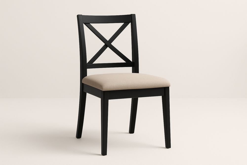 Cadeira de madeira preta com assento estofado, design elegante para interior e exterior.